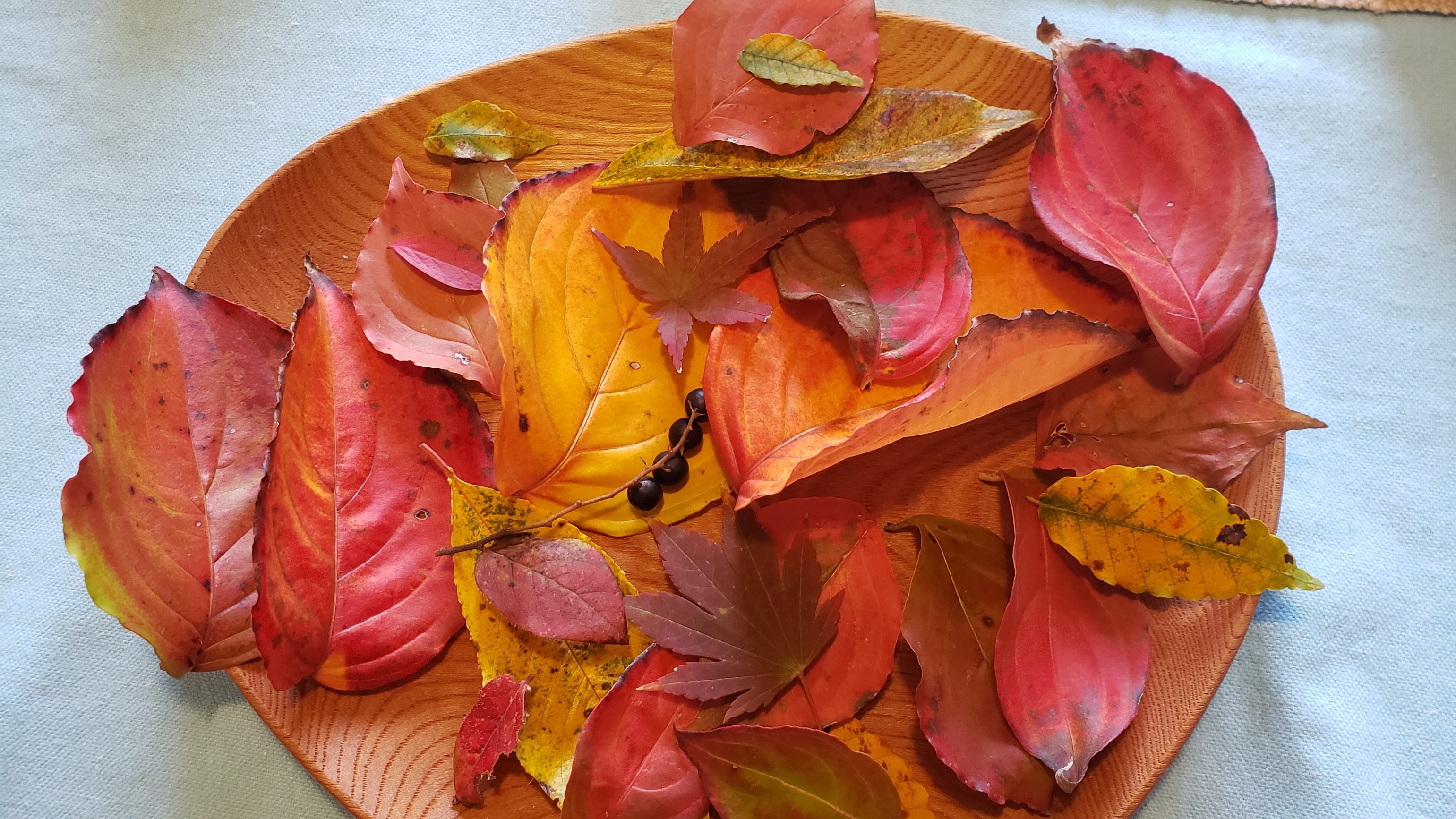 柏の葉はなんとも切ない黄色葉になり、紅葉は今年の酷暑に耐えかねて、ぼんやりした色に染まって。