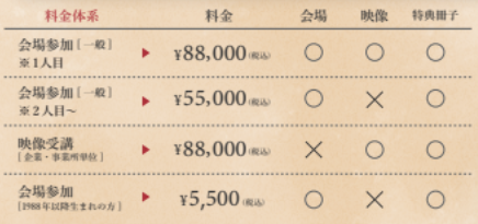 参加費用 | 【会場受講】お一人様88,000円/人(税込)、お二人目以降55,000 円/人(税込)、1988年以降お生まれの方5,500円/人(税込)【映像商品】88,000円/社(税込)※DVDをご希望の場合、会場受講・映像受講を問わず、作成手数料として別途¥2,200(税込) |