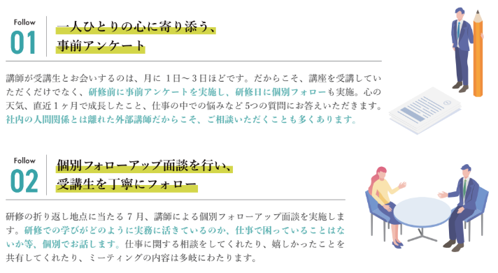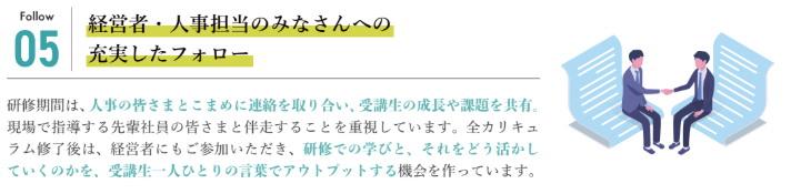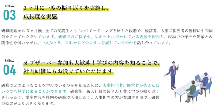 各参加企業様に寄り添ったサポートをしながら、入社後の研修を行うことができるよう、研修開始前に経営者・人事担当者の皆様と事前に打ち合わせを行っています。入社直後の心が動きやすい時期に備え、事前に育成方針を共有します。