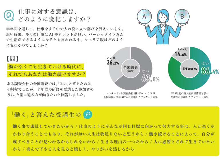 S・Yワークスの人財育成研修では、社会人として基本的に身につけるべきスキルをお伝えすることはもちろん、仕事を通してより良い人生を送っていただくための “思考” の習慣づくりにも重きを置いて、研修をしています。