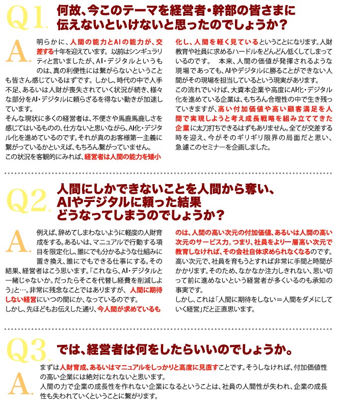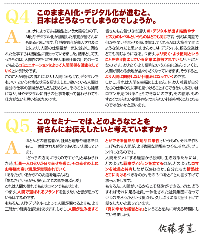 今その答えが曖昧なまま進めば、企業の未来は大きく分かれます。だからこそ今回、経営者が抱えるリアルな疑問・葛藤・迷いに対し佐藤芳直が直接答えるQ&A形式で届けます。-答えは、セミナーの中にあります。